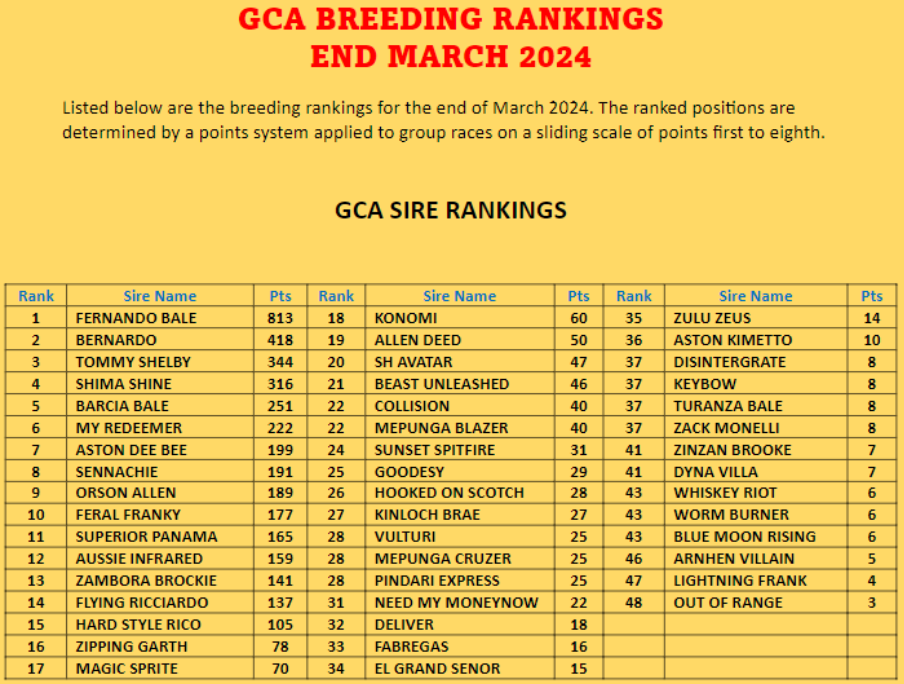 2024年4月2日GCA协会公布澳大利亚格力犬种公积分排行榜(2024年1月1日~2024年3月31日)