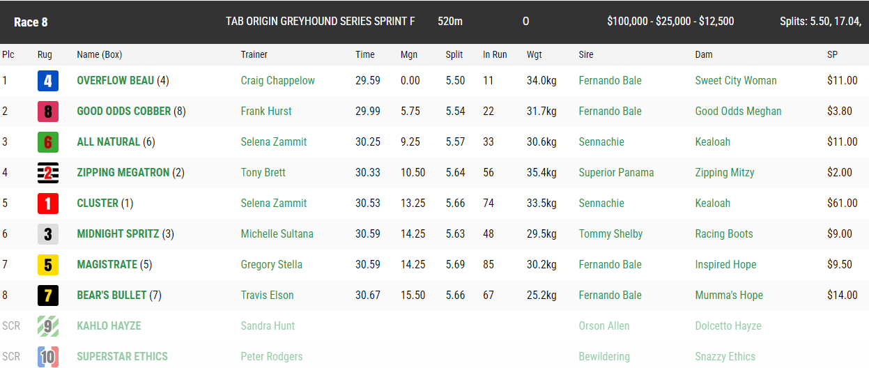 最终4号溢出美以520米29.59秒的绝对优势赢得冠军,科伯好赔率和全天然分列二、三名