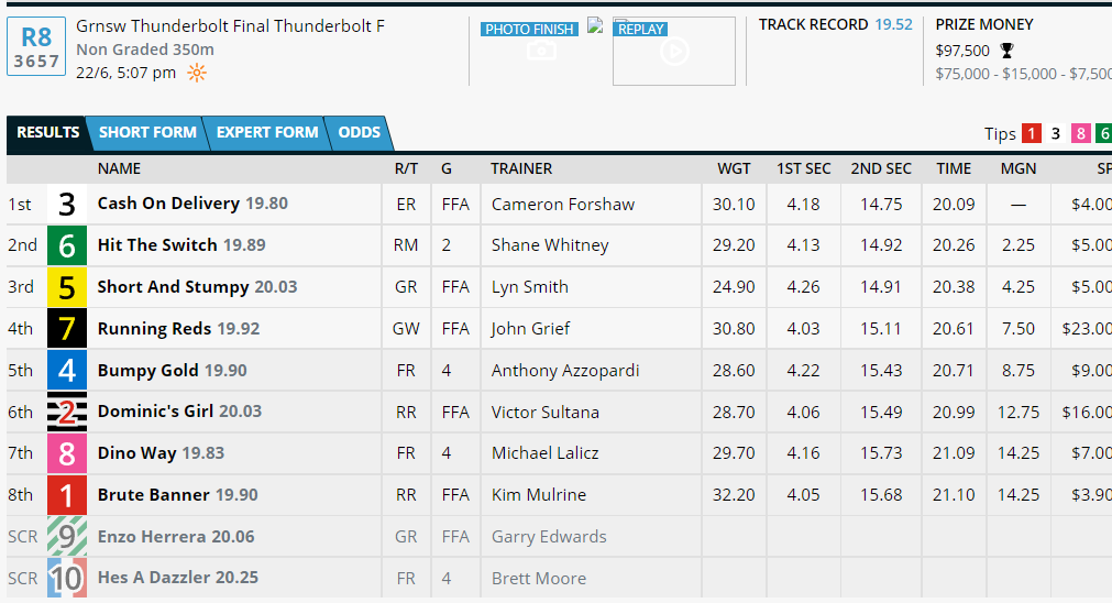3号选手货到付款 Cash On Delivery在开局不利的情况下,中后程发力,以350米20.06秒赢得冠军,第二名是他的同窝兄弟