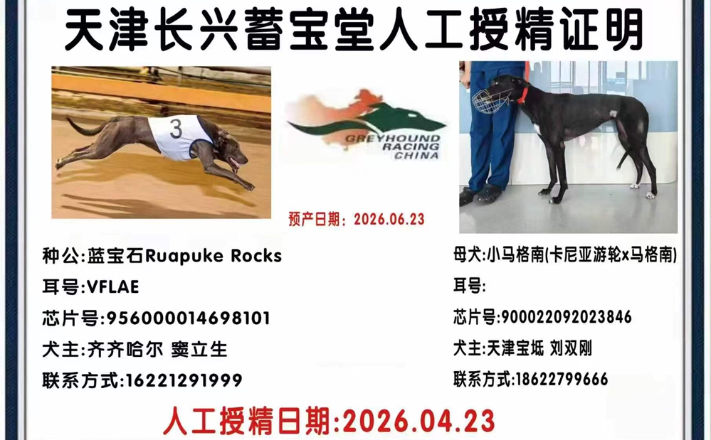 蓝宝石X小马格南 2026年4月23日天津刘双刚的格力犬种母小马格南使用齐齐哈尔窦立生的格力犬种公蓝宝石人工授精 | 蓝宝石 Ruapuke Rocks | 贝尔纳多 Bernardo | 和所有 KC and All | 盖博-道奇Gable Dodge |