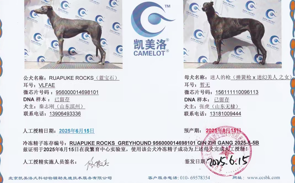 蓝宝石X迷人的枪 2025年6月15日无棣张虎的格力犬种母迷人的枪使用滨州秦志刚的格力犬种公蓝宝石人工授精 | 蓝宝石 Ruapuke Rocks | 贝尔纳多 Bernardo | 和所有 KC and All | 盖博-道奇Gable Dodge |