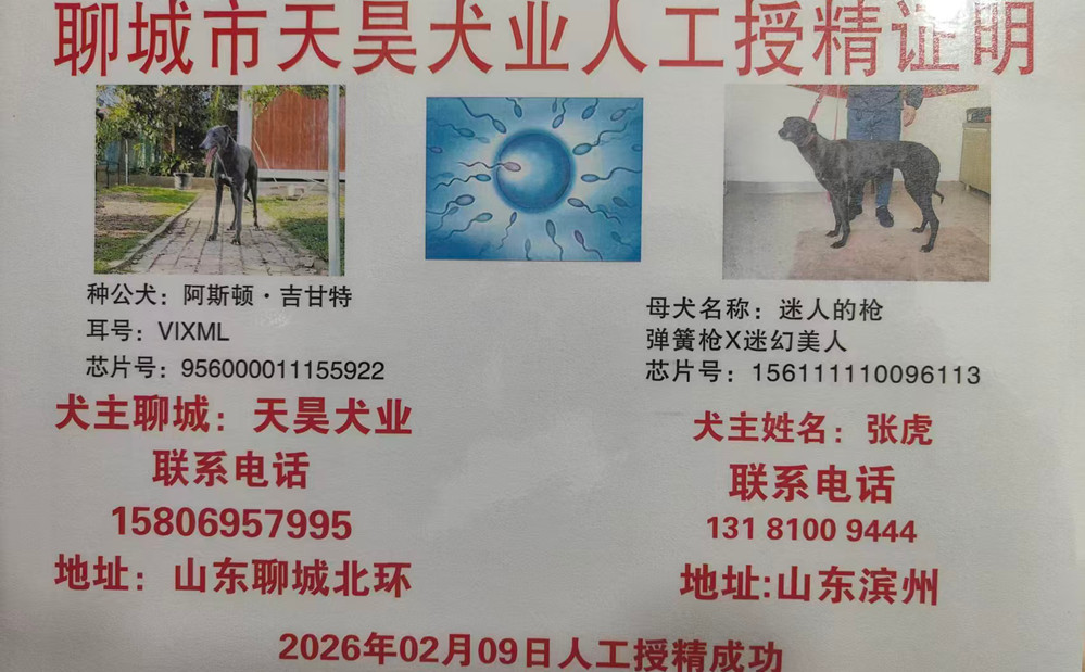 阿斯顿·吉甘特X迷人的枪 2026年2月9日无棣张虎的格力犬种母迷人的枪使用聊城天昊犬业的格力犬种公阿斯顿吉甘特人工授精 | 阿斯顿·吉甘特 Aston Gigante | 和所有 KC and All | 盖博-道奇 Gable Dodge | 棚屋摇晃Wigwam Wag |