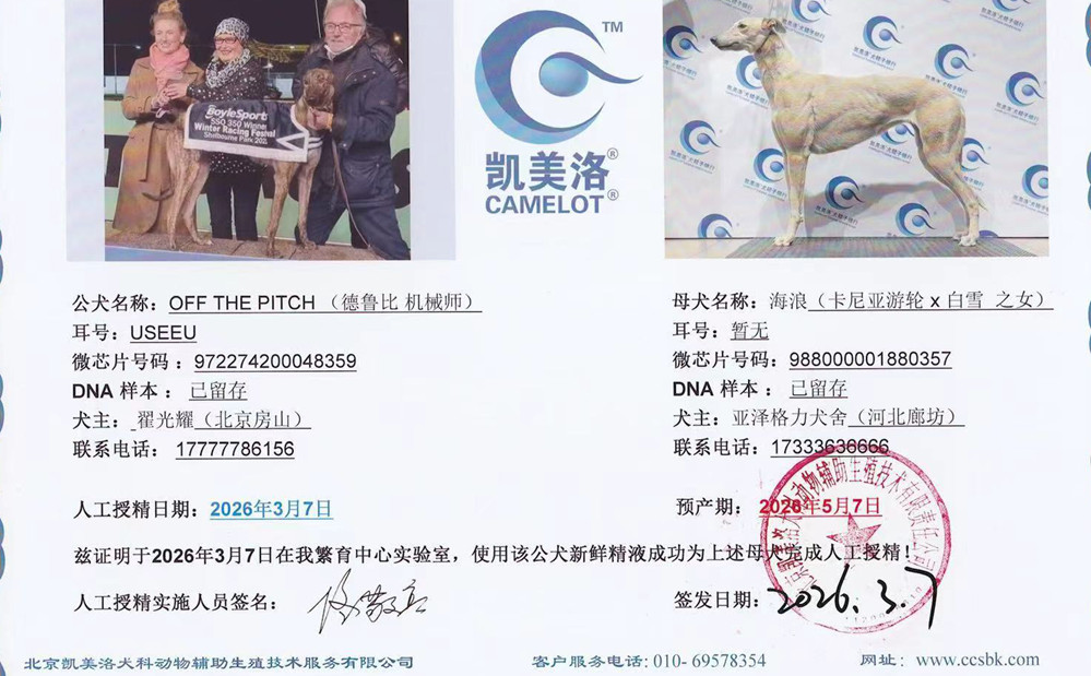 德鲁比·机械师X海浪 2026年3月7日格力犬种母海浪使用邢台翟光耀的格力犬种公机械师人工授精(注:此窝由亚泽繁殖) | 德鲁比·机械师 Off the Pitch | 坠落的战斗机 Droopys Jet | 柔滑百灵鸟 Slip the Lark | 拉克希尔-乔Larkhill Jo |