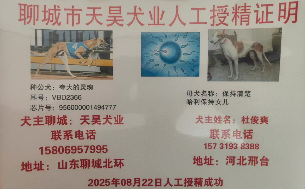 夸大的灵魂X保持清楚 2025年8月22日平乡杜俊爽的格力犬种母保持清楚使用聊城天昊犬业的格力犬种公夸大的灵魂人工授精 | 夸大的灵魂 Alpe D'Huez | 夸大的设拉子 Bombastic Shiraz | 黑设拉子 Black Shiraz | 金杰Ginger |