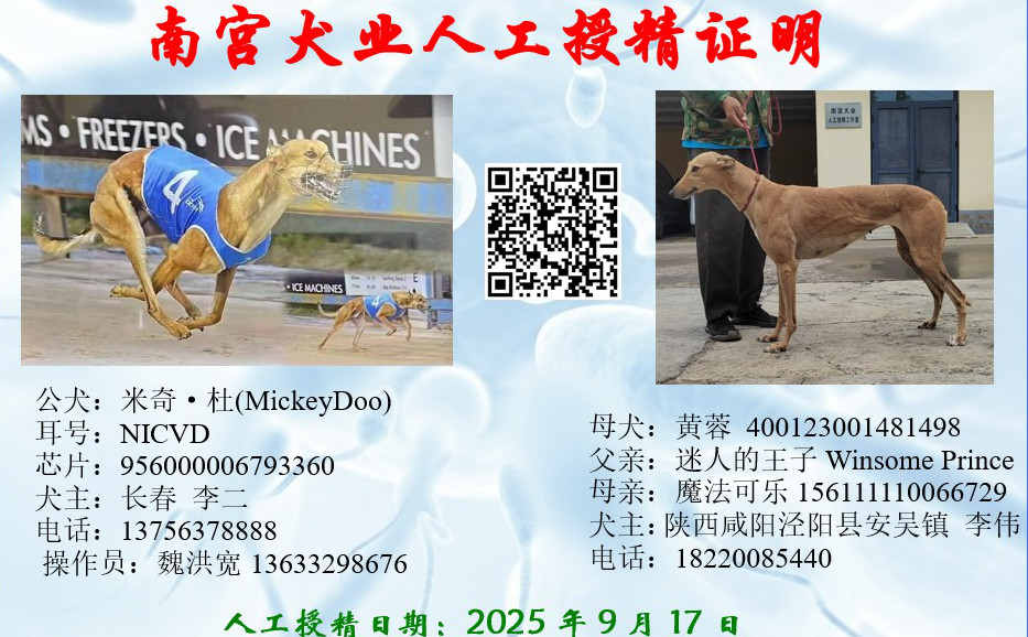 米奇杜X黄蓉 2025年9月17日泾阳李伟的格力犬种母黄蓉使用长春李二的格力犬种公米奇杜人工授精 | 米奇杜 Mickey Doo | 阿斯顿迪比 Aston Dee Bee | 巴西亚贝尔 Barcia Bale | 去掉野性衬衫裤Go Wild Teddy |