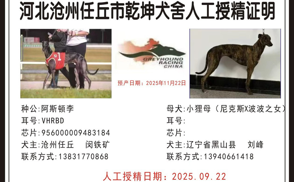 阿斯顿李X小狸母 2025年9月22日锦州刘峰的格力犬种母小狸母使用任丘乾坤犬舍的格力犬种公阿斯顿李人工授精 | 阿斯顿李 Aston Lee | 布瑞特李 Brett Lee | 枪法奥斯蒂 Gun Law Osti | 狐狸兄弟Brother Fox |