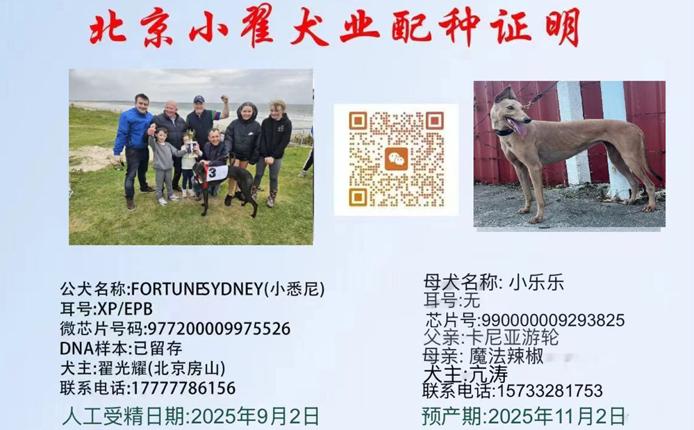 小悉尼X小乐乐 2025年9月2日定州亢涛的格力犬种母小乐乐使用邢台翟光耀的格力犬种公小悉尼人工授精 | 小悉尼 YY11019 | 坠落的悉尼 Droopys Sydney | 特别公爵 Duke Special | 巴利马克梅芙Ballymac Maeve |
