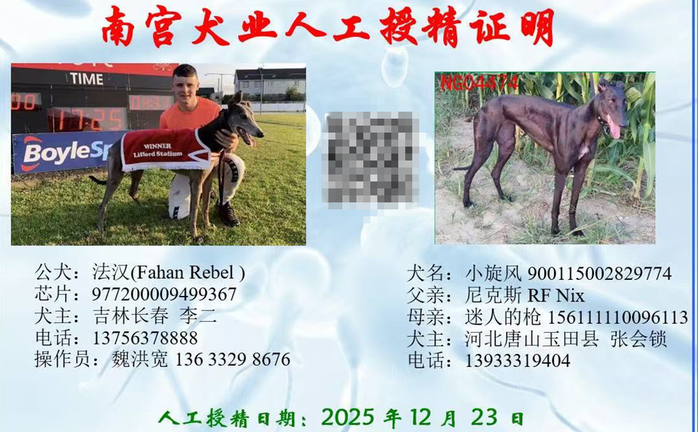 法汉X小旋风 2025年12月23日玉田张会锁的格力犬种母小旋风使用长春李二的格力犬种公法汉人工授精 | 法汉 Fahan Rebel | 最佳巴利马克 Ballymac Best | 巴利马克梅芙 Ballymac Maeve | 罗亚诺克Roanokee |