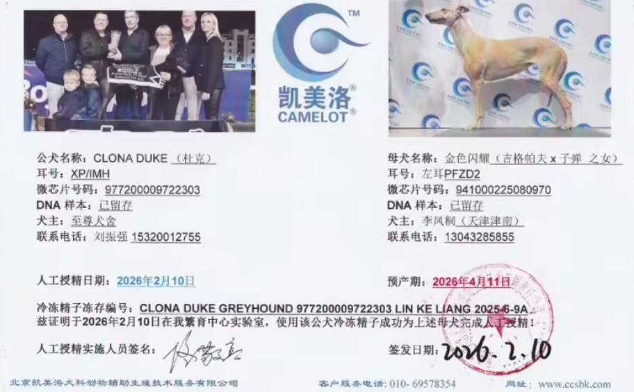 杜克X金色闪耀 2026年2月10日津南李凤桐的格力犬种母金色闪耀使用静海至尊犬舍的格力犬种公杜克人工授精 | 杜克 Clona Duke | 玛拉基 Malachi | 明确意见 Definate Opinion | 海浪洛里安Surf Lorian |