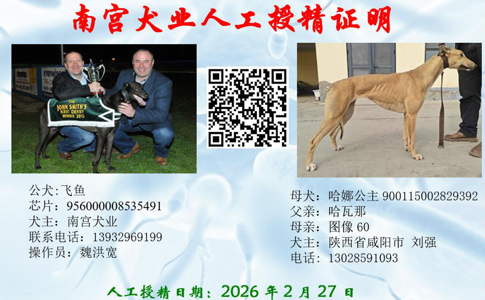飞鱼X哈娜公主 2026年2月27日咸阳刘强的格力犬种母哈娜公主使用南宫犬业的格力犬种公飞鱼人工授精 | 飞鱼 Exocet | 头部约束 Head Bound | 头上司 Head Honcho | 徒步旅行者希德Walkabout Sid |