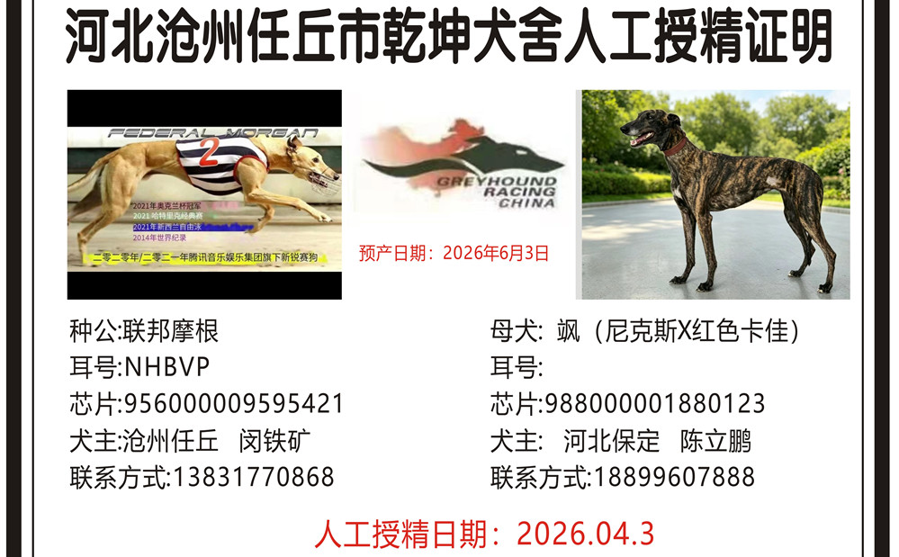 联邦摩根X飒 2026年4月3日格力犬种母飒使用任丘乾坤犬舍的格力犬种公联邦摩根人工授精(注:保定陈立鹏繁殖此窝) | 联邦摩根 Federal Morgan | 巴西亚贝尔 Barcia Bale | 去掉野性衬衫裤 Go Wild Teddy | 头上司Head Honcho |