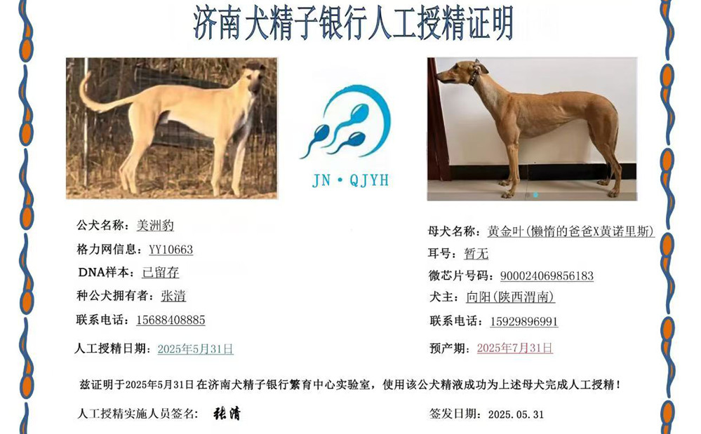 美洲豹X黄金叶 2025年5月31日西安向阳的格力犬种母黄金叶使用济南张清的格力犬种公美洲豹人工授精 | 美洲豹 YY10663 | 超级巴拿马 Superior Panama | 和所有 KC and All | 盖博-道奇Gable Dodge |