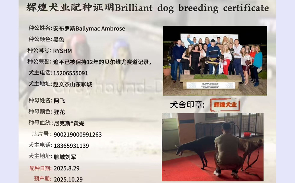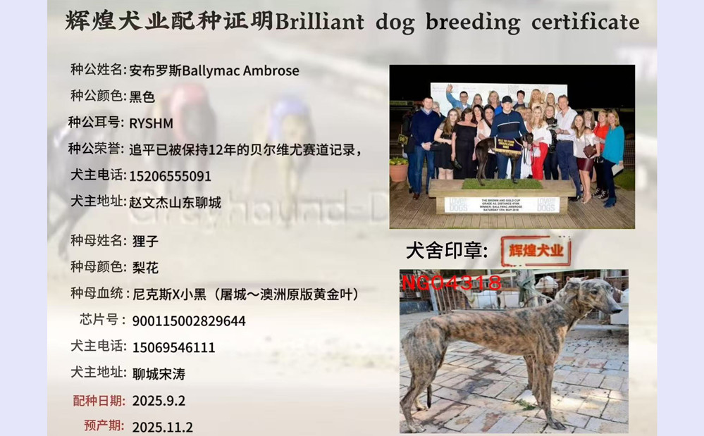 巴利马克·安布罗斯 Ballymac Ambrose 2016年11月出生于爱尔兰,在英国参赛,绿网记录34场比赛19次第一、4次第二、3次第三,2019年8月31日以470米27.20秒追平已被保持12年的贝尔维尤赛道记录,后落户平阴赵文杰处