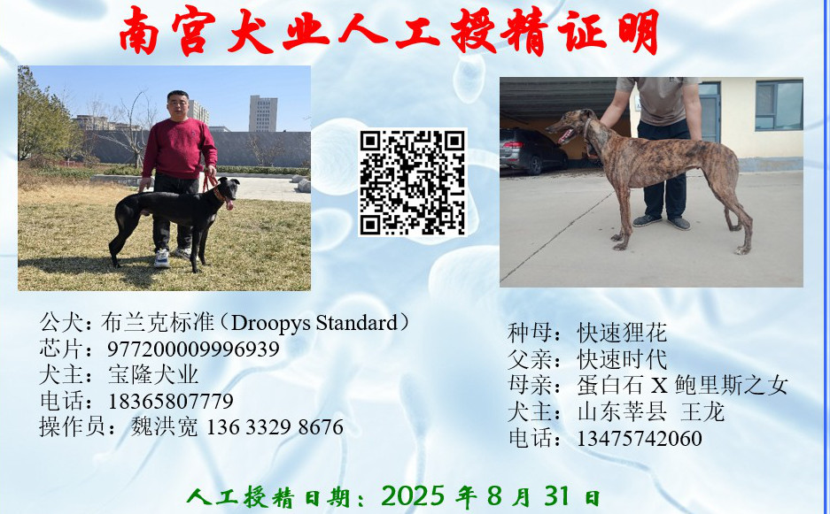 布莱克标准 Droopys Standard 2021年9月出生于爱尔兰,后征战于英国,职业生涯30次参赛,7次第一、3次第二、8次第三,2023年7月30日在以277米16.25秒打破中央公园赛道记录,2023年8月6日以16.20秒赢得OR3级别少女冲刺赛冠军,比自己之前的赛道记录又提升0.05秒,2024年6月15日获得OR1级别肯特银盘杯季军,后落户聊城李孔贞处(注:OR1是英国的最高级别赛事) | 笑声黑色 Laughil Blake | 布瑞特李 Brett Lee | 枪法奥斯蒂 Gun Law Osti | 狐狸兄弟Brother Fox |