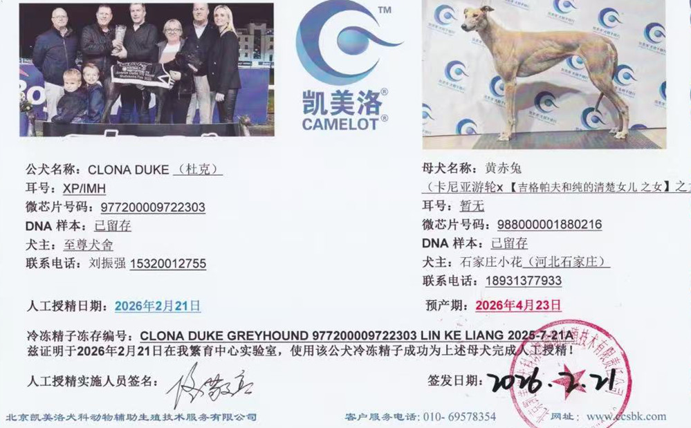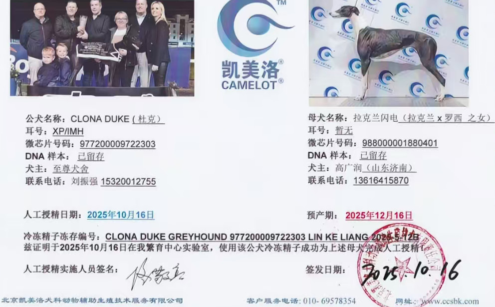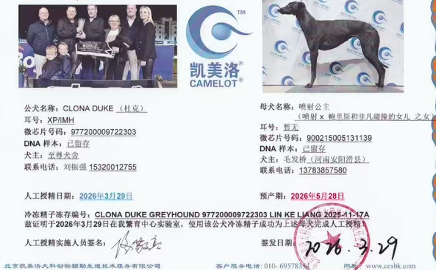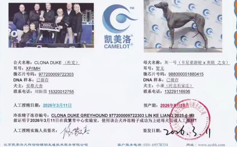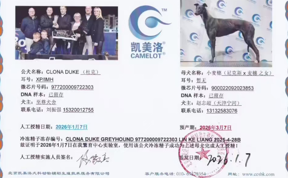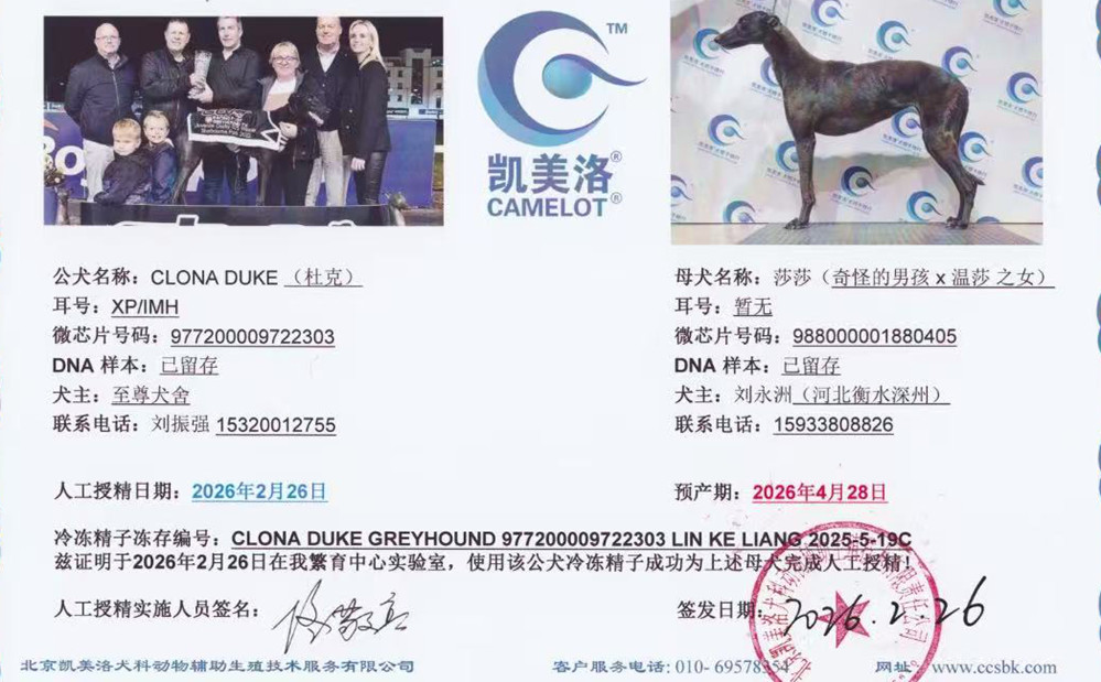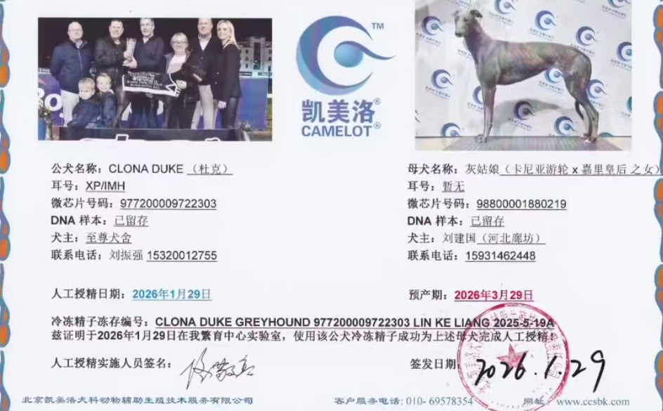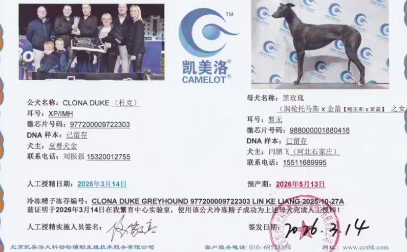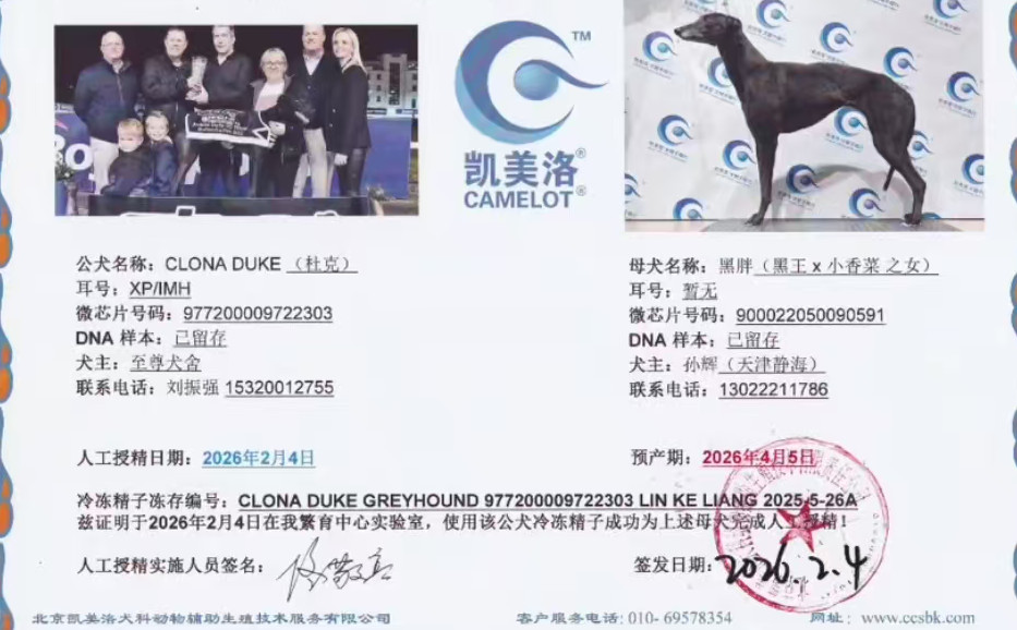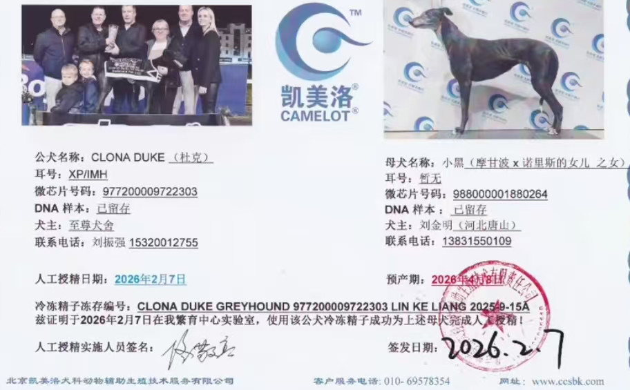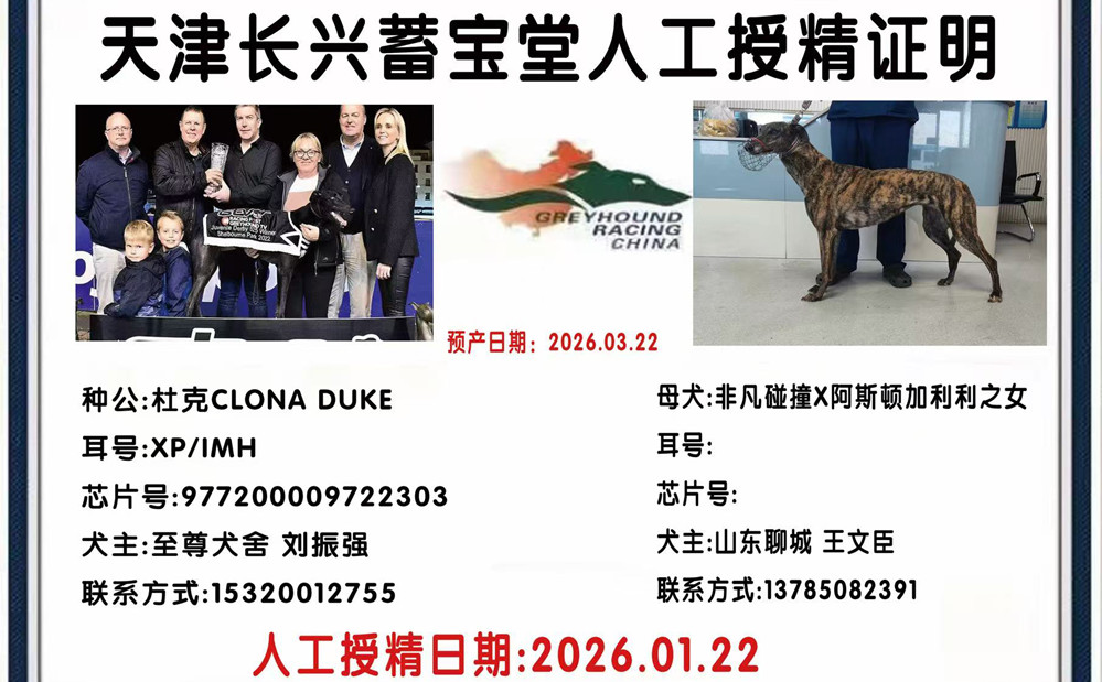 杜克 Clona Duke 2021年3月17日出生于爱尔兰,后在爱尔兰和英国两地交替征战,职业生涯总计38场比赛22次第一、5次第二、4次第三,GRI协会评选2022年度未来之星,爱尔兰少年德比冠军,爱尔兰少年竞争赛冠军,英国精选锦标赛冠军,爱尔兰精选锦标赛冠军,爱尔兰复活节亚军、英国德比决赛参赛者,荣获3次赛道记录(其中2次打破赛道记录,1次追平十年未被打破的赛道记录),后落户静海至尊犬舍