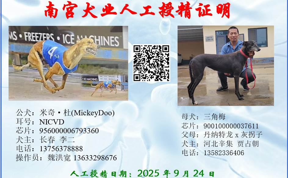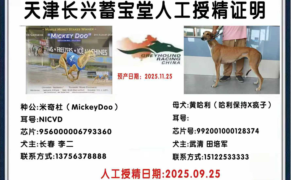 米奇杜X黄哈利 2025年9月25日武清田培军的格力犬种母黄哈利使用长春李二的格力犬种公米奇杜人工授精 | 米奇杜 Mickey Doo | 阿斯顿迪比 Aston Dee Bee | 巴西亚贝尔 Barcia Bale | 去掉野性衬衫裤Go Wild Teddy |