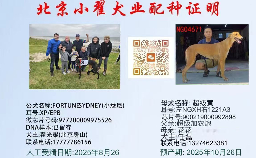 小悉尼 YY11019 2021年5月5日出生于爱尔兰,职业生涯50场比赛,11次第一、11次第二、4次第三,后落户邢台翟光耀处 (注:英文原名、耳号、芯片号等信息暂时隐藏,已经在后台存档)