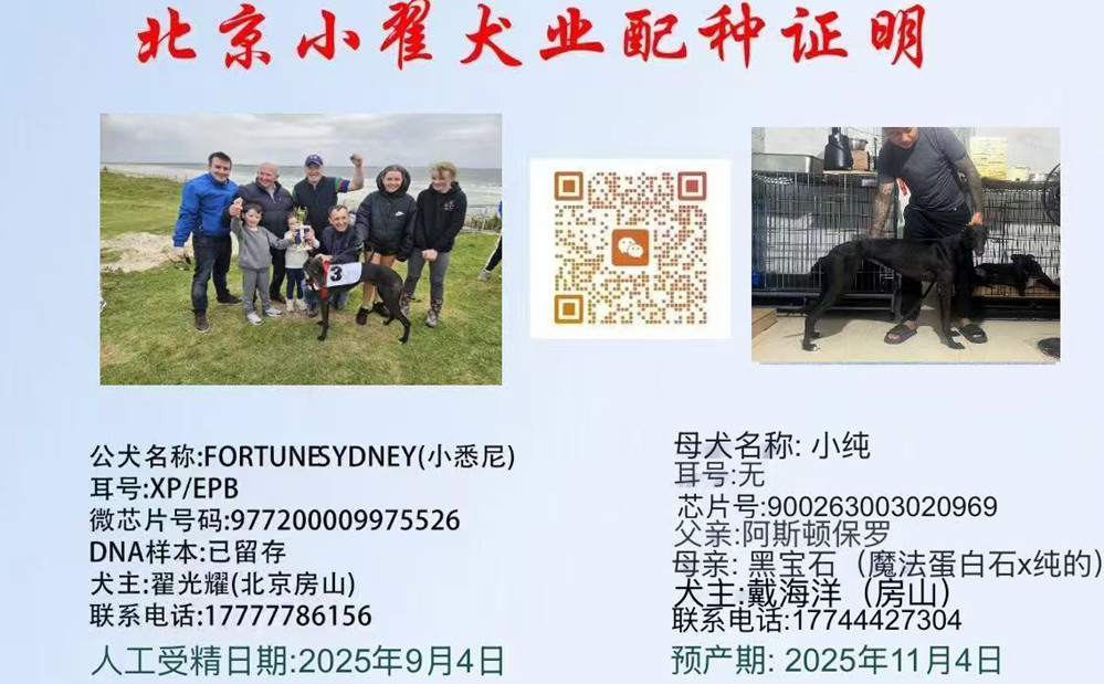 小悉尼X小纯 2025年9月4日房山戴海洋的格力犬种母小纯使用邢台翟光耀的格力犬种公小悉尼配种 | 小悉尼 YY11019 | 坠落的悉尼 Droopys Sydney | 特别公爵 Duke Special | 巴利马克梅芙Ballymac Maeve |