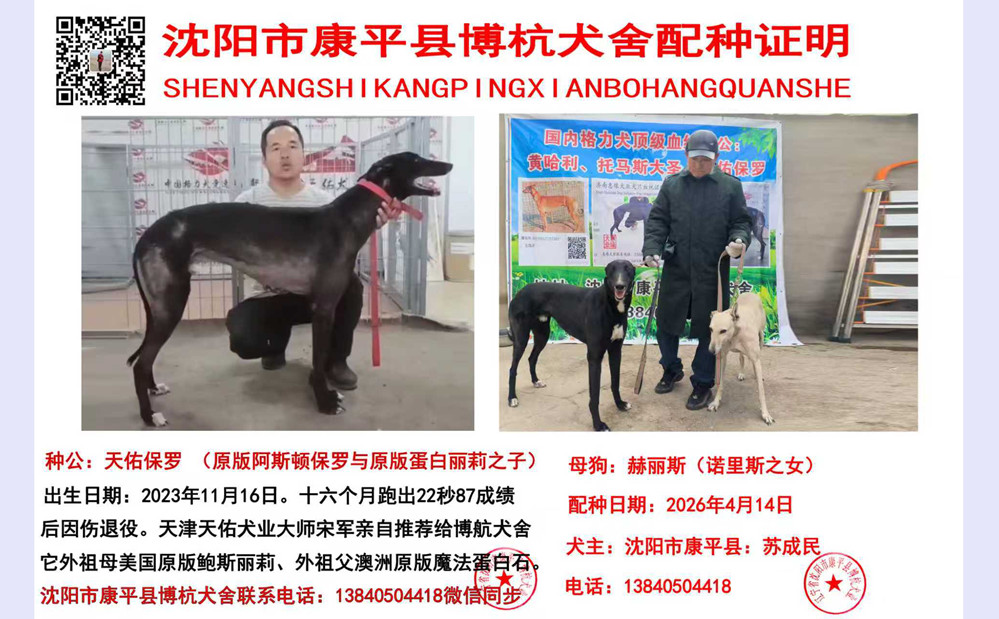 天佑保罗X赫丽斯 2025年8月9日康平苏成民的格力犬种母赫丽斯使用康平苏成民的格力犬种公天佑保罗配种 | 天佑保罗 900239912309178 | 阿斯顿保罗 Aston Bolero | 法布雷加斯 Fabregas | 夸大的设拉子Bombastic Shiraz |