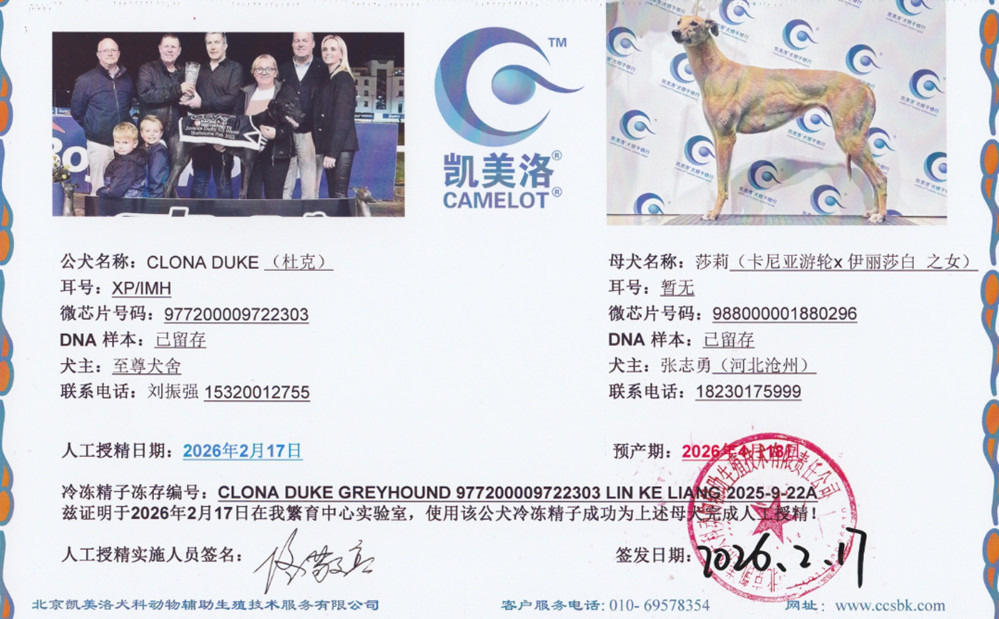 杜克X莎莉 2026年2月17日沧州张志勇的格力犬种母莎莉使用静海至尊犬舍的格力犬种公杜克人工授精 | 杜克 Clona Duke | 玛拉基 Malachi | 明确意见 Definate Opinion | 海浪洛里安Surf Lorian |