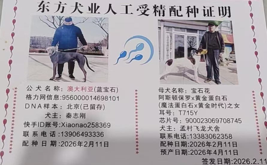 蓝宝石X宝石花 2026年2月11日孟村飞龙犬舍的格力犬种母宝石花使用滨州秦志刚的格力犬种公蓝宝石人工授精 | 蓝宝石 Ruapuke Rocks | 贝尔纳多 Bernardo | 和所有 KC and All | 盖博-道奇Gable Dodge |