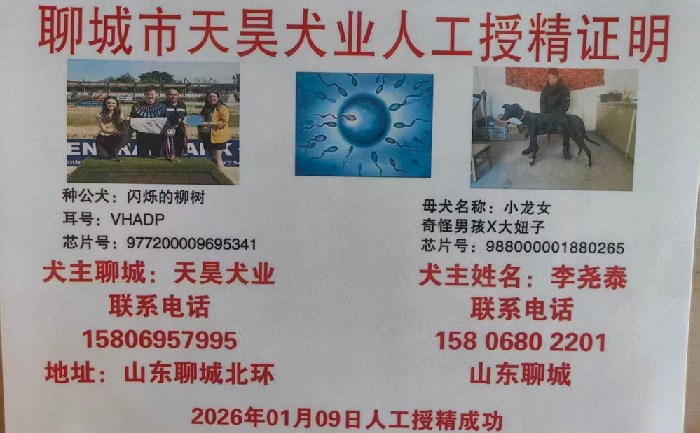 闪烁的柳树X小龙女 2026年1月9日茌平李尧泰的格力犬种母小龙女使用聊城天昊犬业的格力犬种公闪烁的柳树人工授精 | 闪烁的柳树 Flashing Willow | 笑声黑色 Laughil Blake | 布瑞特李 Brett Lee | 枪法奥斯蒂Gun Law Osti |