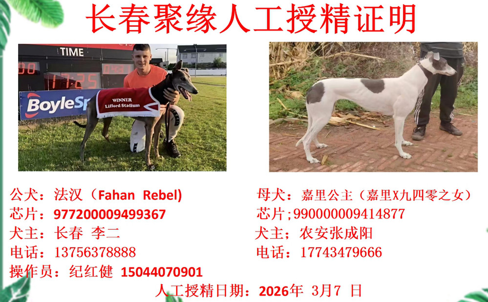 法汉X嘉里公主 2026年3月7日农安张成阳的格力犬种母嘉里公主使用长春李二的格力犬种公法汉人工授精 | 法汉 Fahan Rebel | 最佳巴利马克 Ballymac Best | 巴利马克梅芙 Ballymac Maeve | 罗亚诺克Roanokee |