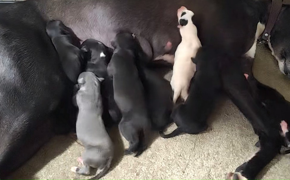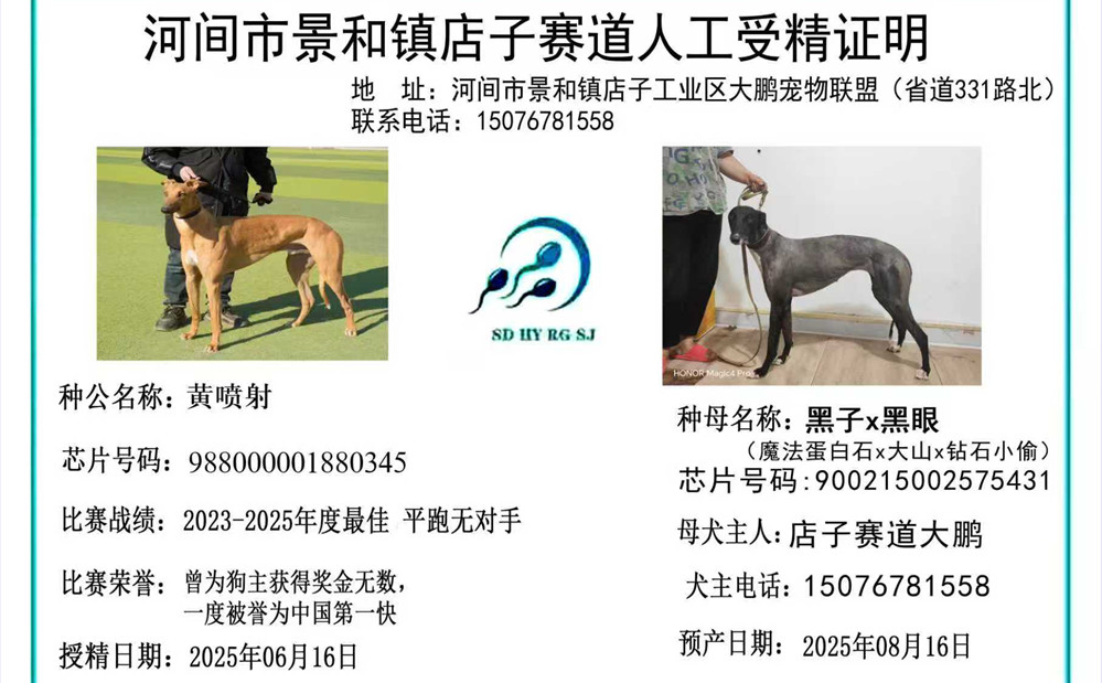 黄喷射X黑子 2025年6月16日河间冯志鹏的格力犬种母黑子使用格力犬种公黄喷射人工授精,并于2025年8月产下8条,6公2母 | 黄喷射 988000001880345 | 喷射 YY4555 | 坠落的战斗机 Droopys Jet | 柔滑百灵鸟Slip the Lark |