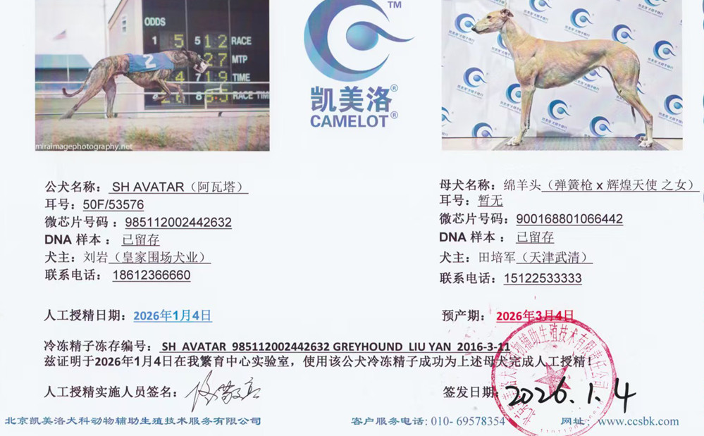 阿瓦塔X绵羊头 2026年1月4日武清田培军的格力犬种母绵羊头使用格力犬种公阿瓦塔人工授精 | 阿瓦塔 SH Avatar | 基奥瓦曼尼 Kiowa Mon Manny | 飞行潘世奇 Flying Penske | 奥什科什-瑞瑟Oshkosh Racey |