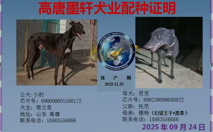 小豹X尼克 2025年9月24日高唐商兰良的格力犬种母尼克使用高唐商兰良的格力犬种公小豹人工授精 | 小豹 990000001568172 | 斗牛士 Matador Mariah | 盛大先生 El Grand Senor | 哪里的佩德罗Where's Pedro |