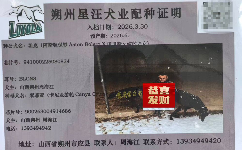 坦克X索菲亚 2026年3月30日朔州周海江的格力犬种母索菲亚使用朔州周海江的格力犬种公坦克配种 | 坦克 941000225080834 | 阿斯顿保罗 Aston Bolero | 法布雷加斯 Fabregas | 夸大的设拉子Bombastic Shiraz |