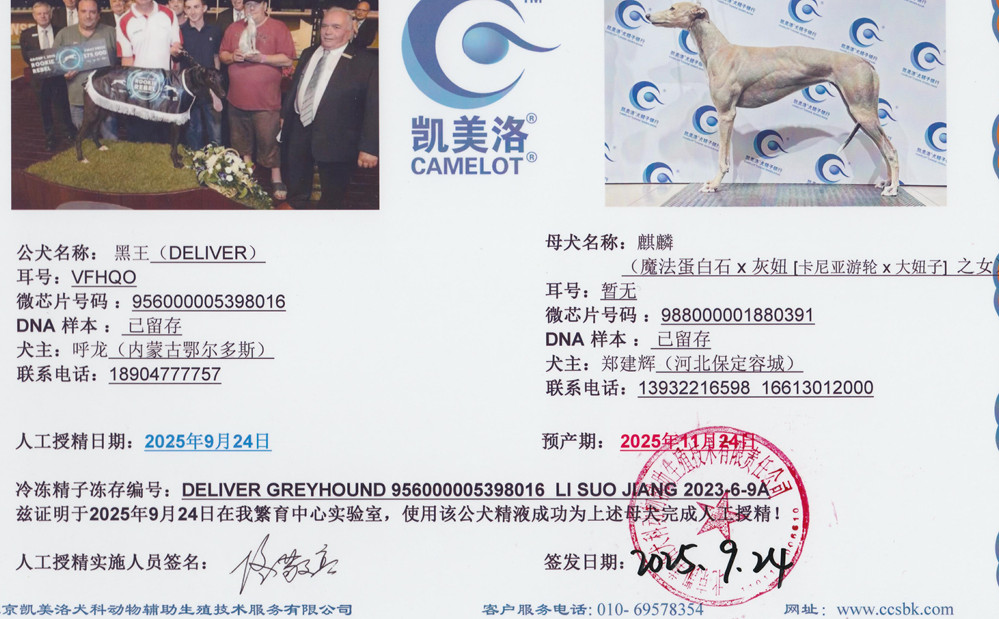 黑王X麒麟 2025年9月24日保定郑建辉的格力犬种母麒麟使用鄂尔多斯延龙的格力犬种公黑王人工授精 | 黑王 YY7617 | 费尔南多 Fernando Bale | 凯尔索 Kelsos Fusileer | 盖博-道奇Gable Dodge |