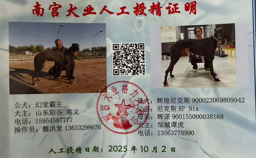 幻觉霸王X辉煌尼克斯 2025年10月2日邹城谭虎的格力犬种母辉煌尼克斯使用阳谷秦文的格力犬种公幻觉霸王人工授精 | 幻觉霸王 988000018880165 | 幻觉王子 Bartrim Bale | 使产生幻觉 Hallucinate | 布瑞特李Brett Lee |