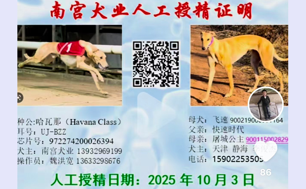 哈瓦那X飞速 2025年10月3日静海李俊杰的格力犬种母飞速使用南宫犬业的格力犬种公哈瓦那人工授精 | 哈瓦那 Havana Class | 世界级 World Class | 来吧游侠 Come On Ranger | 绿园狐狸Greenpark Fox |