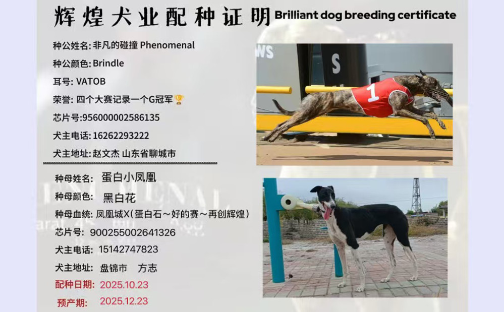 非凡的碰撞X蛋白小凤凰 2025年10月23日盘锦方志的格力犬种母蛋白小凤凰使用格力犬种公非凡的碰撞人工授精 | 非凡的碰撞 Phenomenal | 大碰撞 Collision | 可怕的刺客 Awesome Assassin | 火光Light of Fire |
