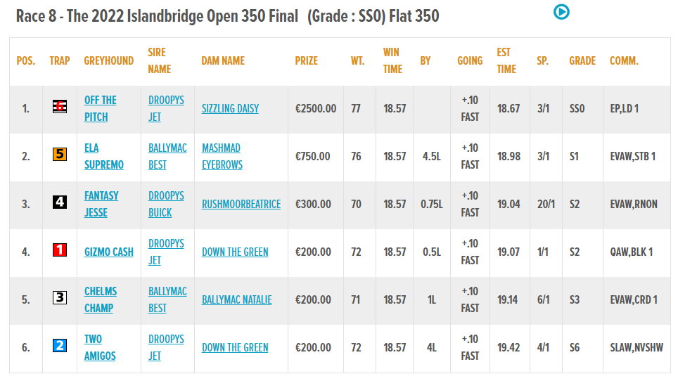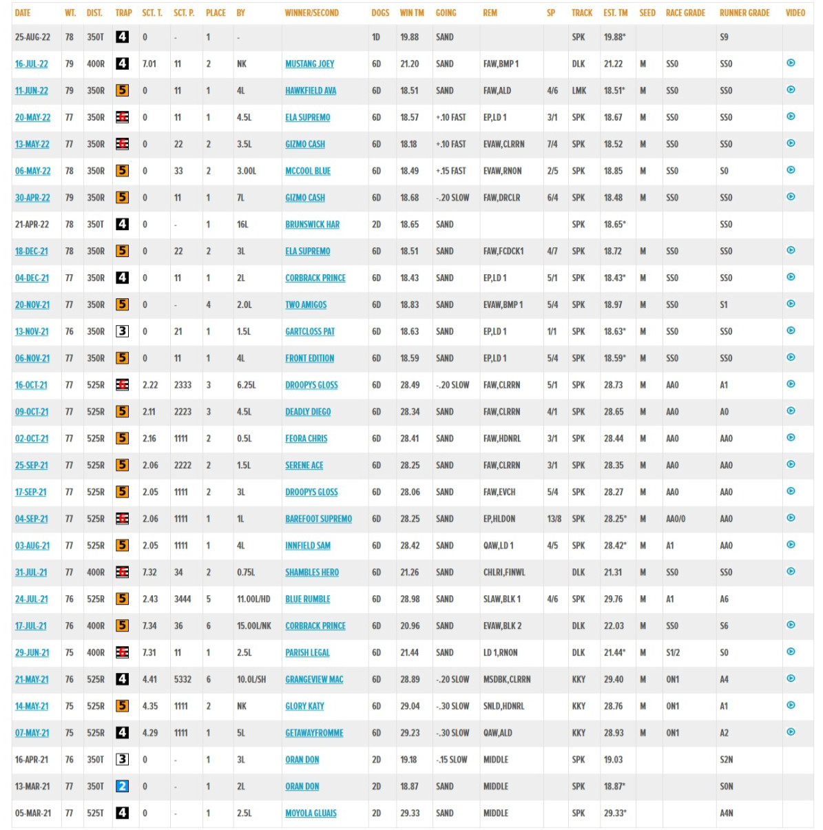 德鲁比·机械师 Off the Pitch 2019年11月1日出生于爱尔兰,职业生涯25场正式比赛10次第一、9次第二、2次第三,2021年12月4日赢得谢尔比冬季比赛节350码冠军,2022年5月20日赢得艾兰桥公开赛350码冠军,后落户邢台翟光耀处 | 坠落的战斗机 Droopys Jet | 柔滑百灵鸟 Slip the Lark | 拉克希尔-乔 Larkhill Jo | 装订工人乔Staplers Jo |