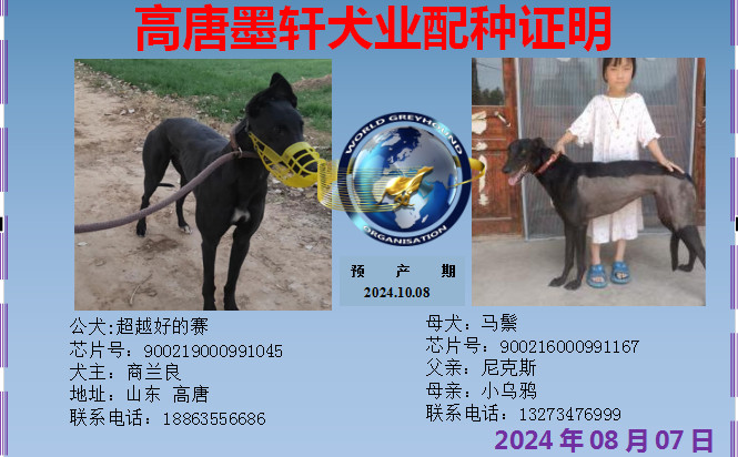 超越好的赛X马鬃 2024年8月7日临西李家赞的格力犬种母马鬃使用高唐商兰良的格力犬种公超越好的赛人工授精 | 超越好的赛 900219000991045 | 梦幻好的赛 900023069809814 | 好的赛 Goodesy | 大碰撞Collision |
