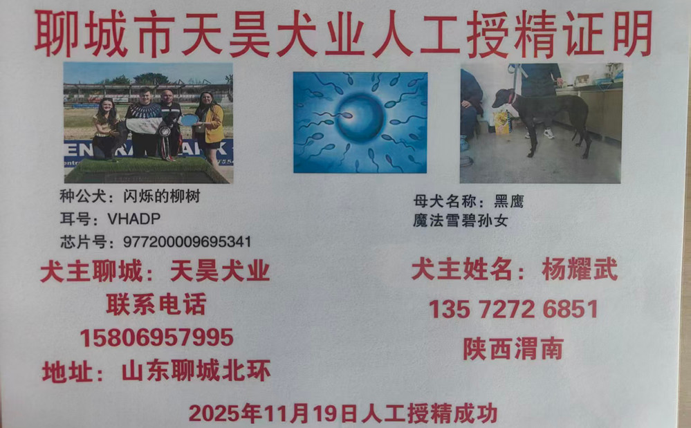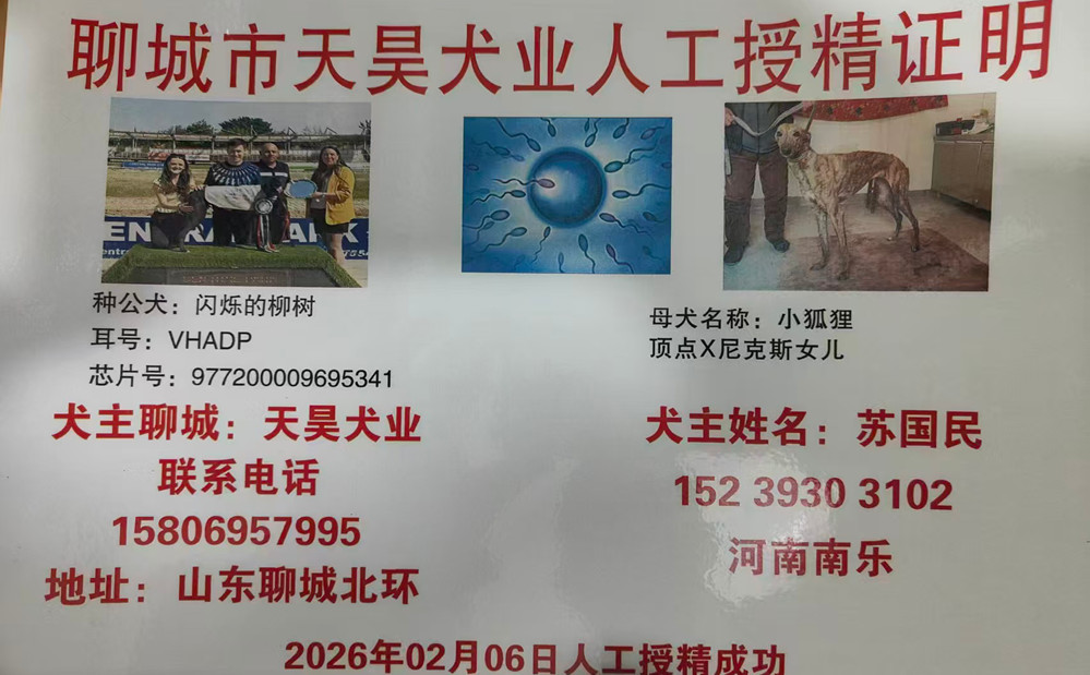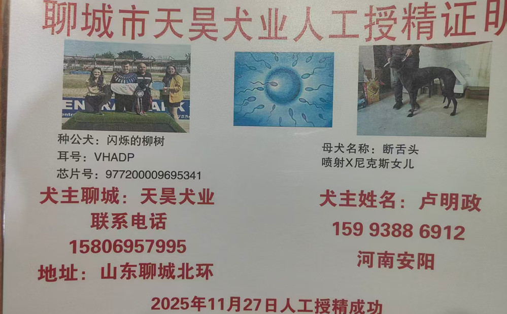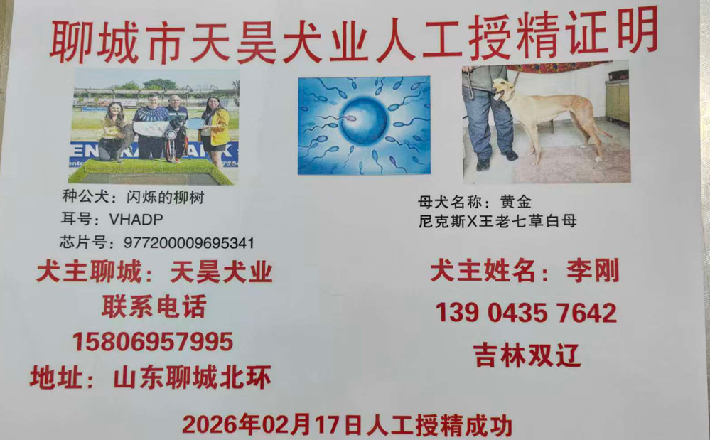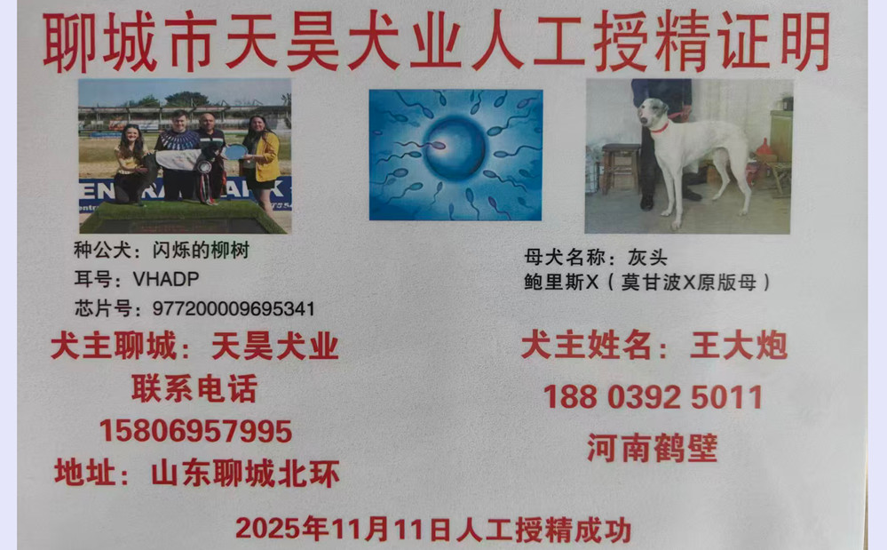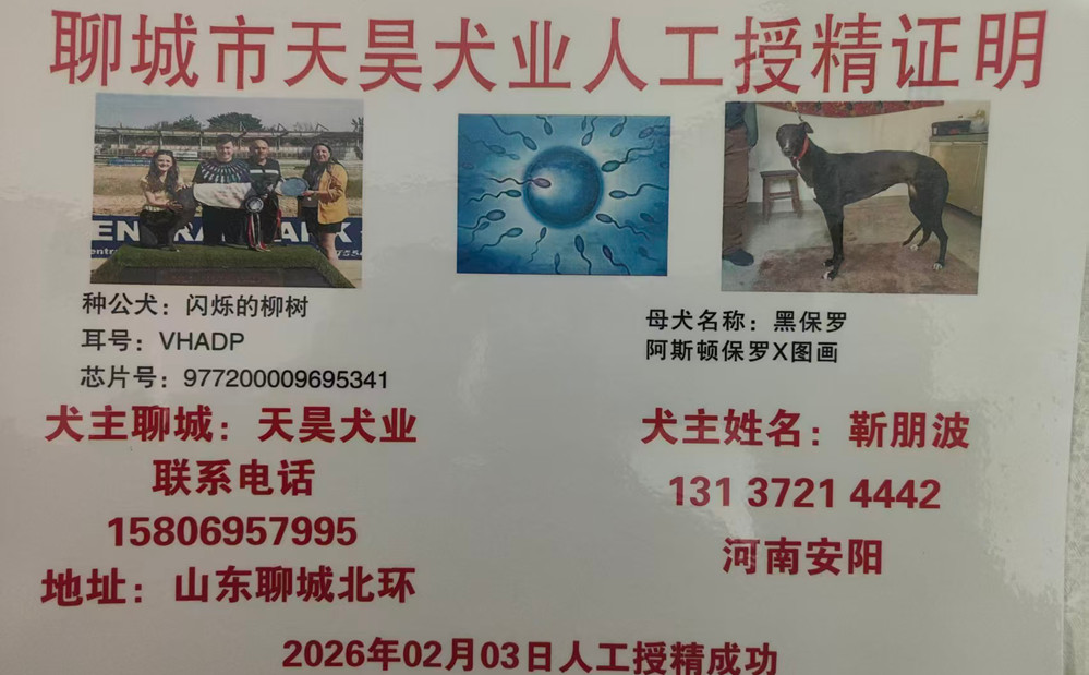 闪烁的柳树 Flashing Willow 2020年5月18日出生于爱尔兰,职业生涯37场比赛,23次第一、3次第二、8次第三,其中4场比赛在英国参赛,2023年6月11日赢得英国OR1级别肯特银盘杯冠军,2022年6月11日以270米15.42秒打破托斯特赛道记录,2022年5月28日以325码(约297米)17.12秒打破特拉利赛道记录,2023年4月15日赢得格力犬和宠物世界冲刺赛冠军,后落户聊城天昊犬业