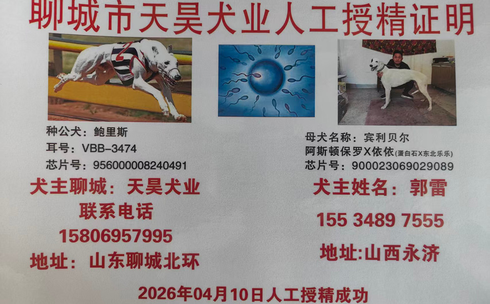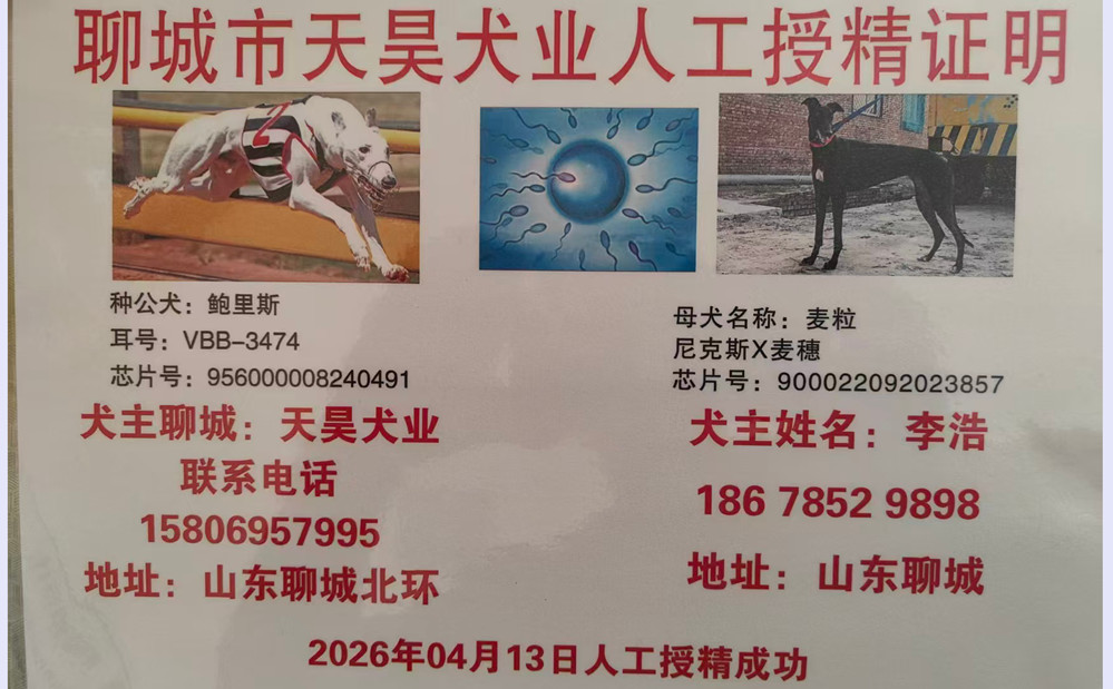 鲍里斯X麦粒 2026年4月13日茌平李浩的格力犬种母麦粒使用聊城天昊犬业的格力犬种公鲍里斯人工授精 | 鲍里斯 Boris Fields | 诺里斯 Knocka Norris | 精华情形 Elite State | 最好的Just the Best |