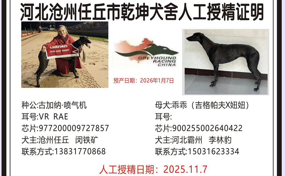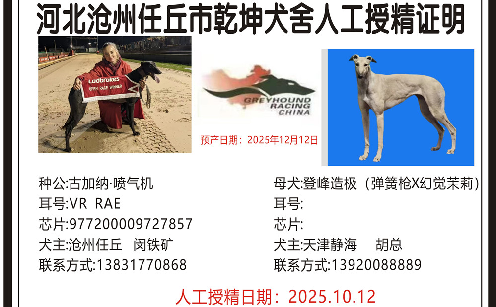古加纳喷气机X乖乖 2025年11月7日霸州李林豹的格力犬种母乖乖使用任丘乾坤犬舍的格力犬种公古加纳喷气机人工授精 | 古加纳喷气机 Gougane Jet | 坠落的战斗机 Droopys Jet | 柔滑百灵鸟 Slip the Lark | 拉克希尔-乔Larkhill Jo |