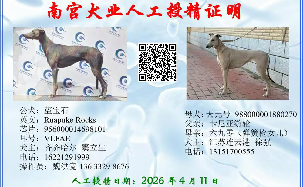 蓝宝石X天元号 2026年4月11日连云港徐强的格力犬种母天元号使用齐齐哈尔窦立生的格力犬种公蓝宝石人工授精 | 蓝宝石 Ruapuke Rocks | 贝尔纳多 Bernardo | 和所有 KC and All | 盖博-道奇Gable Dodge |