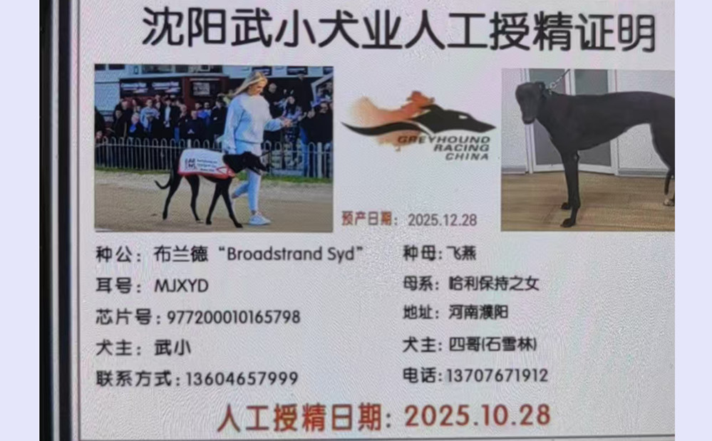 布兰德X飞燕 2025年10月28日南乐石雪林的格力犬种母飞燕使用武小的格力犬种公布兰德人工授精 | 布兰德 Broadstrand Syd | 坠落的悉尼 Droopys Sydney | 特别公爵 Duke Special | 巴利马克梅芙Ballymac Maeve |