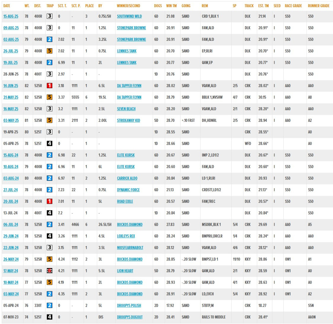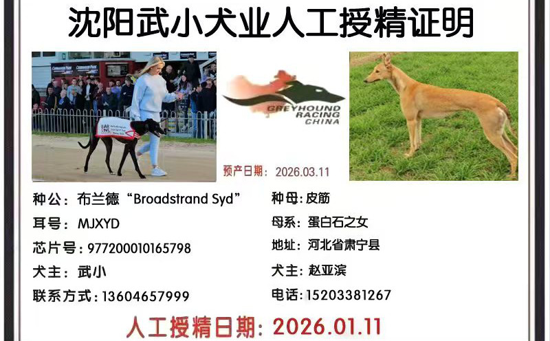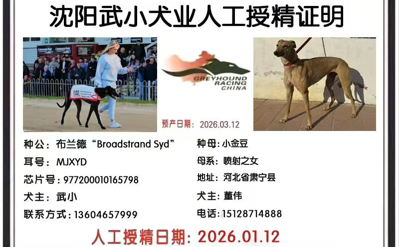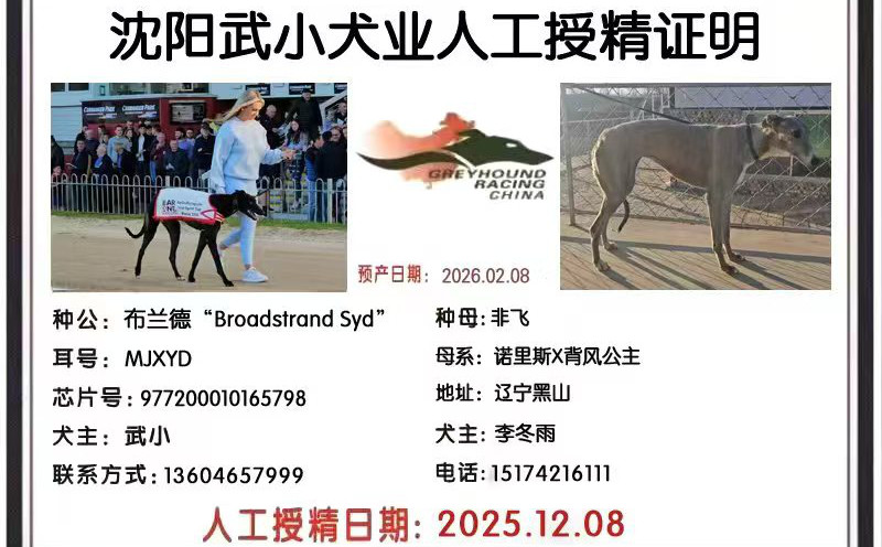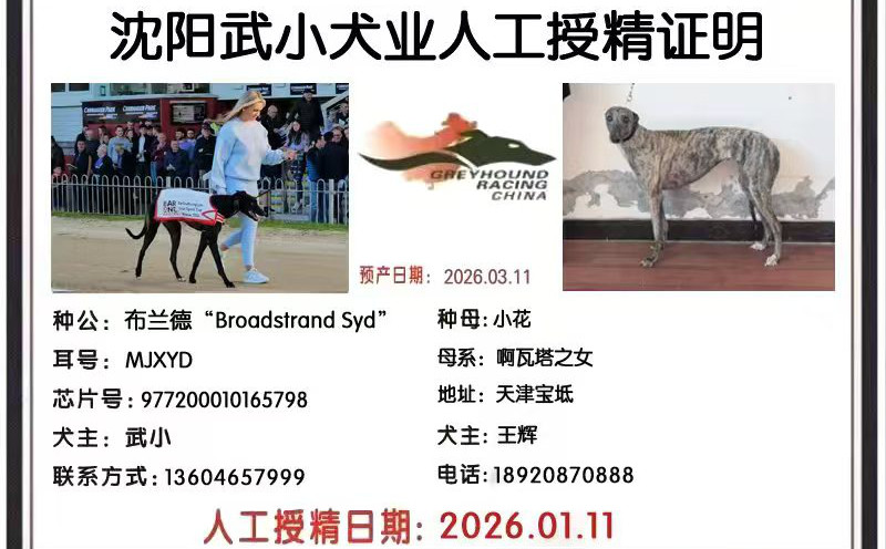 布兰德 Broadstrand Syd 公犬,2022年8月1日出生于爱尔兰,职业生涯21场比赛,14次第一、4次第二、1次第三,创造邓克多赛道400码赛道记录20.57秒,2024年爱尔兰短跑公开赛冠军,后落户武小处