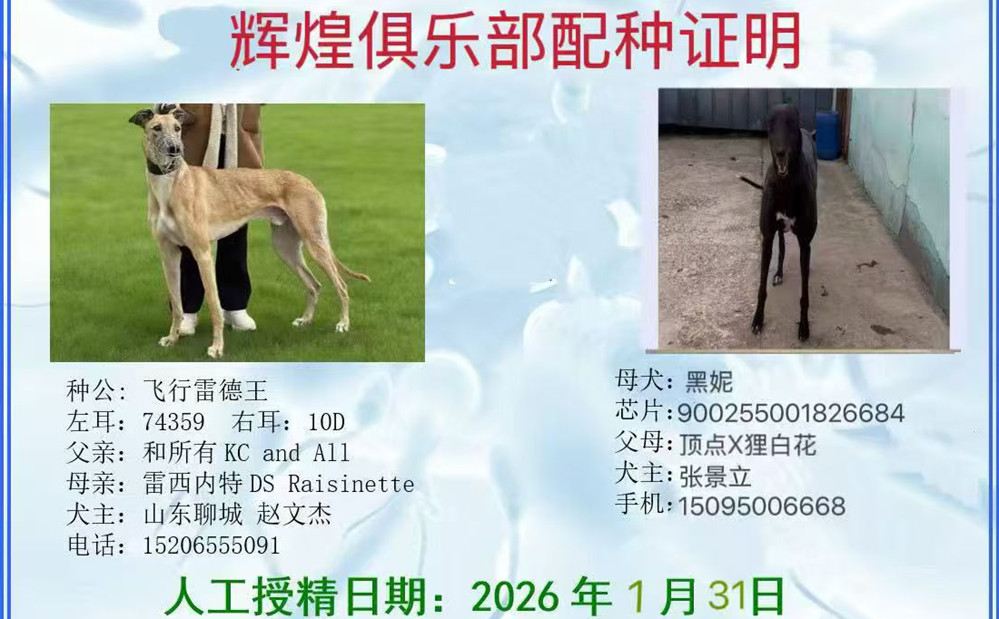 飞行雷德王X黑妮 2026年1月31日格力犬种母黑妮使用聊城赵文杰的格力犬种公飞行雷德王人工授精(注:聊城张景立繁殖此窝) | 飞行雷德王 YY11857 | 和所有 KC and All | 盖博-道奇 Gable Dodge | 棚屋摇晃Wigwam Wag |
