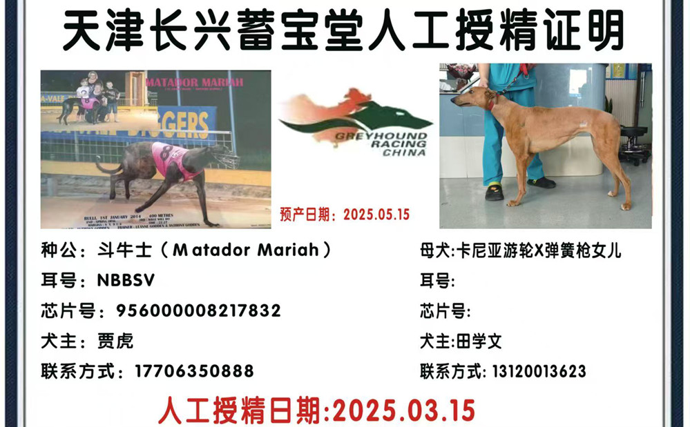 斗牛士X梦幻游轮 2025年3月15日北京田学文的格力犬种母梦幻游轮使用格力犬种公斗牛士人工授精 | 斗牛士 Matador Mariah | 盛大先生 El Grand Senor | 哪里的佩德罗 Where's Pedro | 布瑞特李Brett Lee |