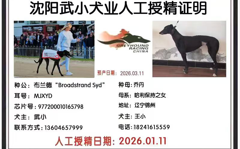 布兰德X乔丹 2026年1月11日锦州王小子的格力犬种母乔丹使用武小的格力犬种公布兰德人工授精 | 布兰德 Broadstrand Syd | 坠落的悉尼 Droopys Sydney | 特别公爵 Duke Special | 巴利马克梅芙Ballymac Maeve |