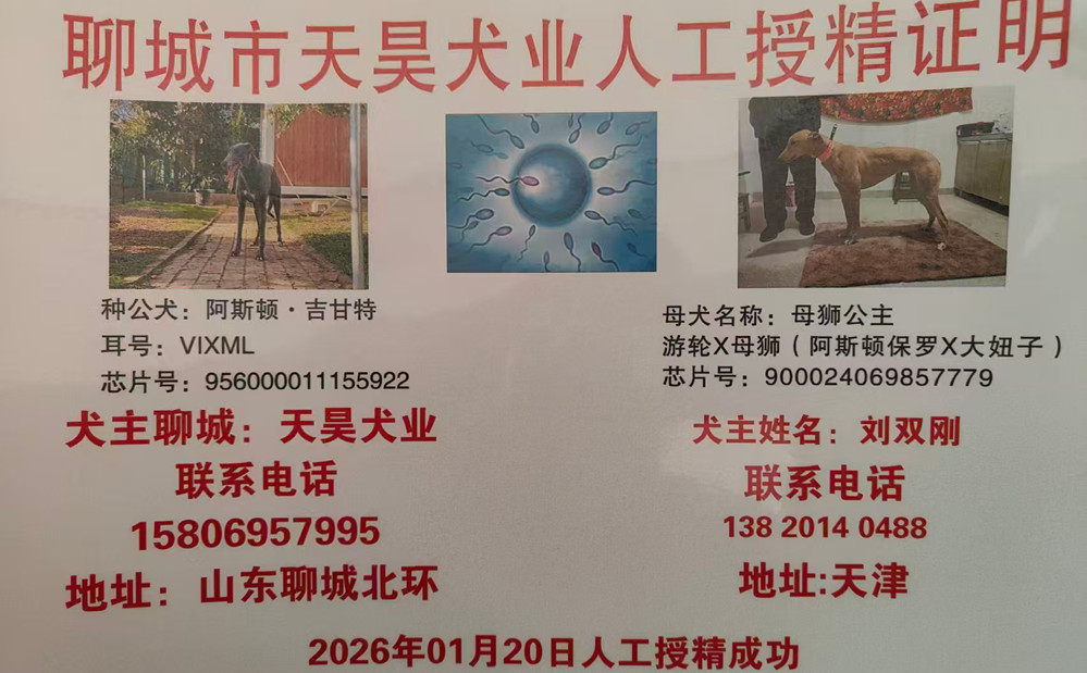 阿斯顿·吉甘特X母狮公主 2026年1月20日宝坻李士龙的格力犬种母母狮公主使用聊城天昊犬业的格力犬种公阿斯顿吉甘特人工授精(注:刘双刚的名额) | 阿斯顿·吉甘特 Aston Gigante | 和所有 KC and All | 盖博-道奇 Gable Dodge | 棚屋摇晃Wigwam Wag |