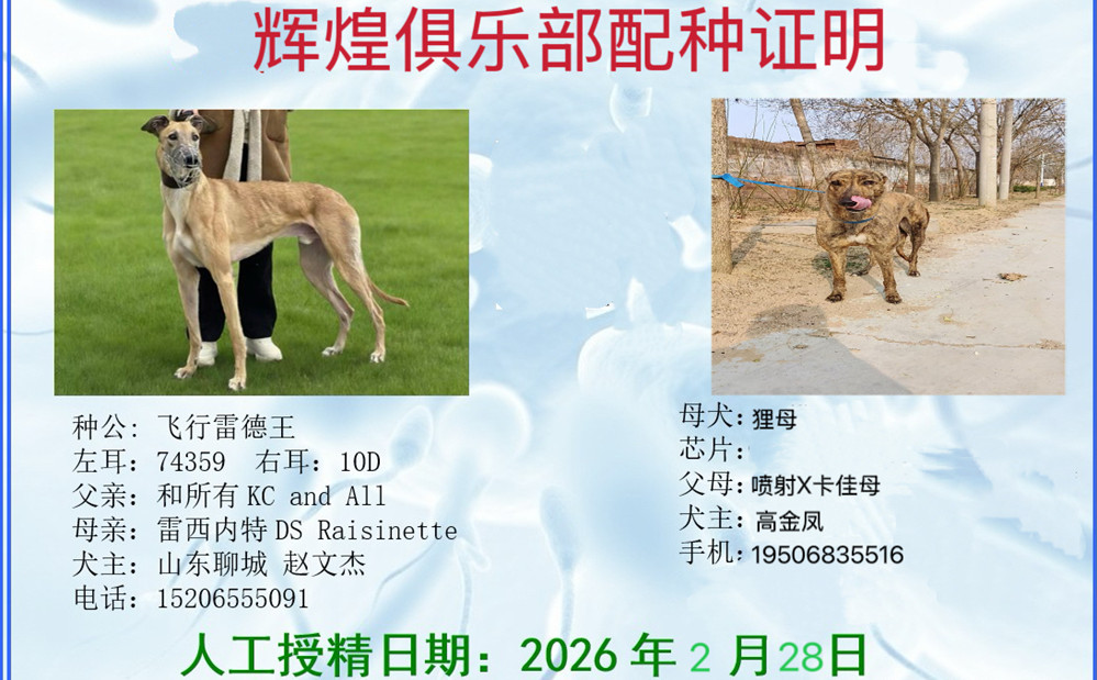 飞行雷德王 YY11857 2020年1月8日出生于美国,后落户聊城赵文杰处(注:英文原名和耳号暂时隐藏)