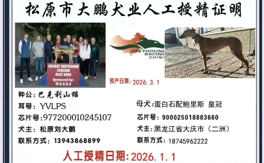 巴克利山猫X皇冠 2026年1月1日大庆冀二洲的格力犬种母皇冠使用松原刘大鹏的格力犬种公巴克利山猫人工授精,并于2026年3月产下8条,5公3母 | 巴克利山猫 Crokers Barky | 多罗塔斯野猫 Dorotas Wildcat | 维克 Ballymac Vic | 金洛克斜坡Kinloch Brae |