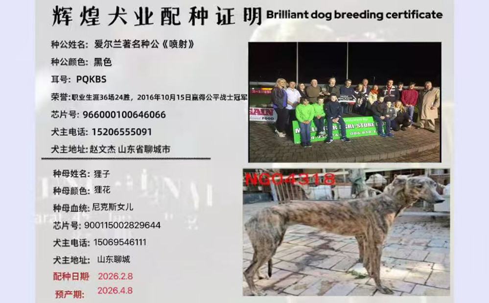 喷射X梨子 2026年2月8日聊城宋涛的格力犬种母梨子使用聊城赵文杰的格力犬种公喷射人工授精,并于2026年4月产下6条,3公3母 | 喷射 YY4555 | 坠落的战斗机 Droopys Jet | 柔滑百灵鸟 Slip the Lark | 拉克希尔-乔Larkhill Jo |